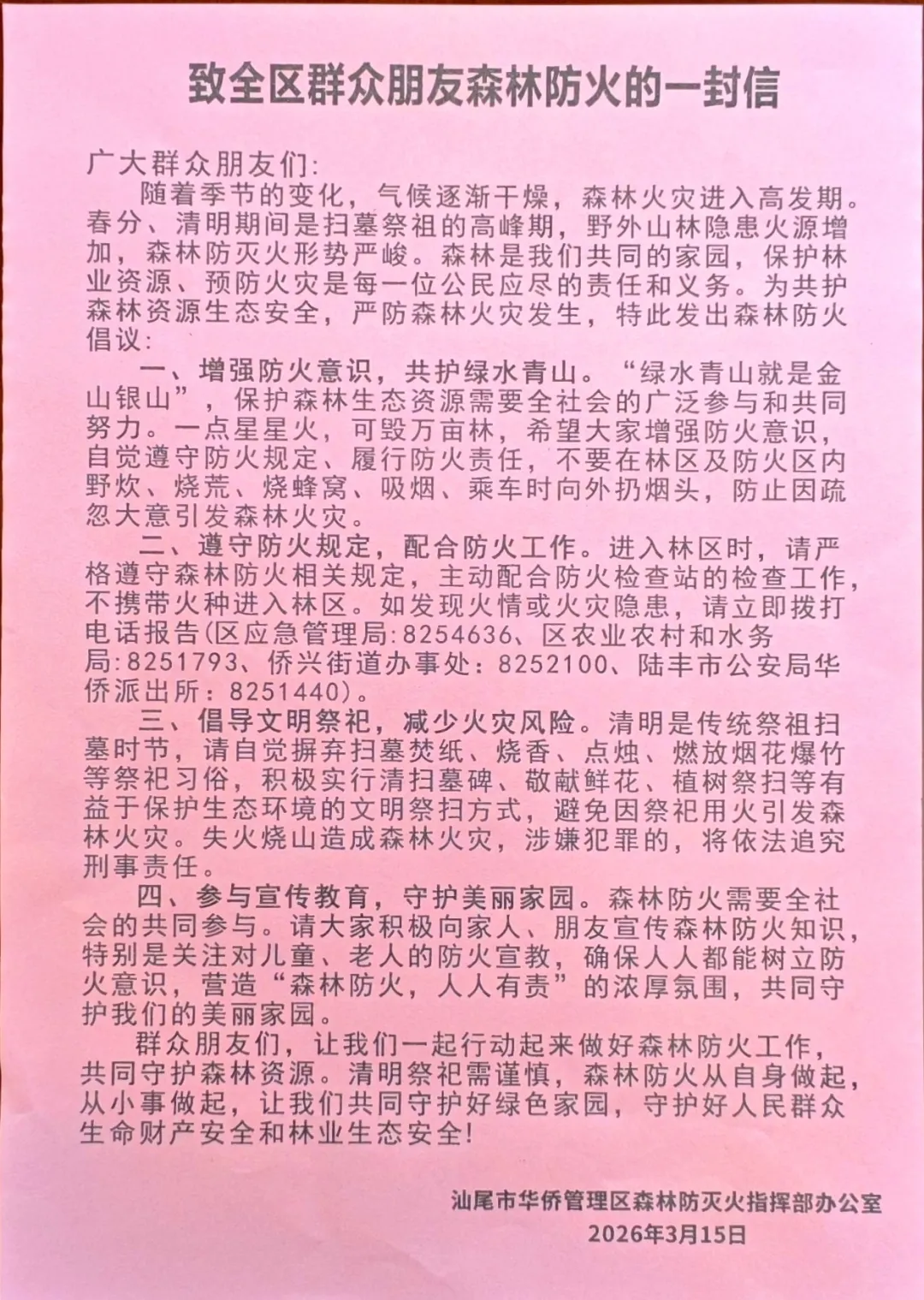 清明临近,森林防灭火进入关键期。汕尾市华侨管理区坚持将守护群众安全作为检验干部担当的“试金石”,各级党组织及党员干部闻令而动,以“四个一线”为抓手,落实“包山头、守卡口、盯重点、灭隐患”举措,全力织密织牢森林防火网,确保责任、宣传、管控、保障“四到位”。