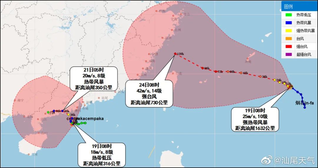 19日08时,南海北部的热带低压加强发展为今年第7号台风“查帕卡”(热带风暴级),其中心位于我市西南方约316公里的南海海面上,预计其将缓慢靠近珠江口到粤西沿海,并可能于20日夜间到21日早晨以热带风暴或强热带风暴级别在上述沿海地区登陆。