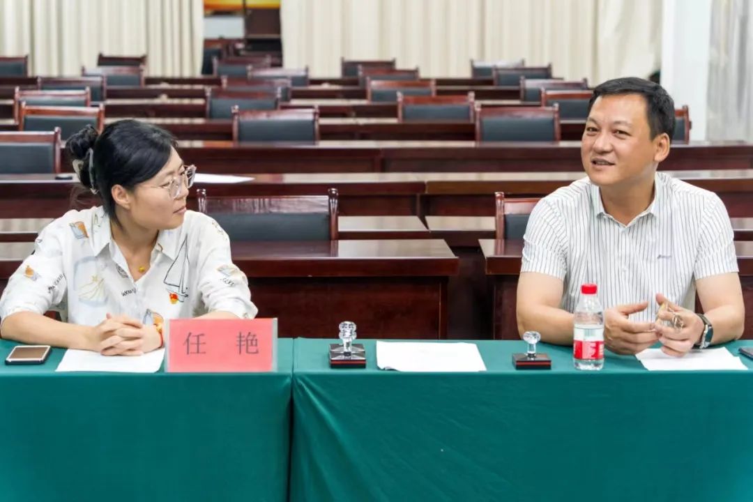 ▲实践团指导老师任艳与侨兴街道党工委副书记、办事处主任蔡汉龙交流实践成果
