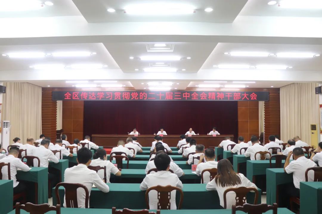 7月23日,全区传达学习贯彻党的二十届三中全会精神干部大会召开,传达学习习近平总书记在党的二十届三中全会上的重要讲话和全会精神,深入学习贯彻总书记视察广东系列重要讲话重要指示精神,以及省委常委会(扩大)会议、全省干部大会的会议精神、市委常委会(扩大)会议、全市干部大会精神,研究部署我区学习宣传贯彻工作。区委书记、区管委会主任林永长主持会议并讲话。