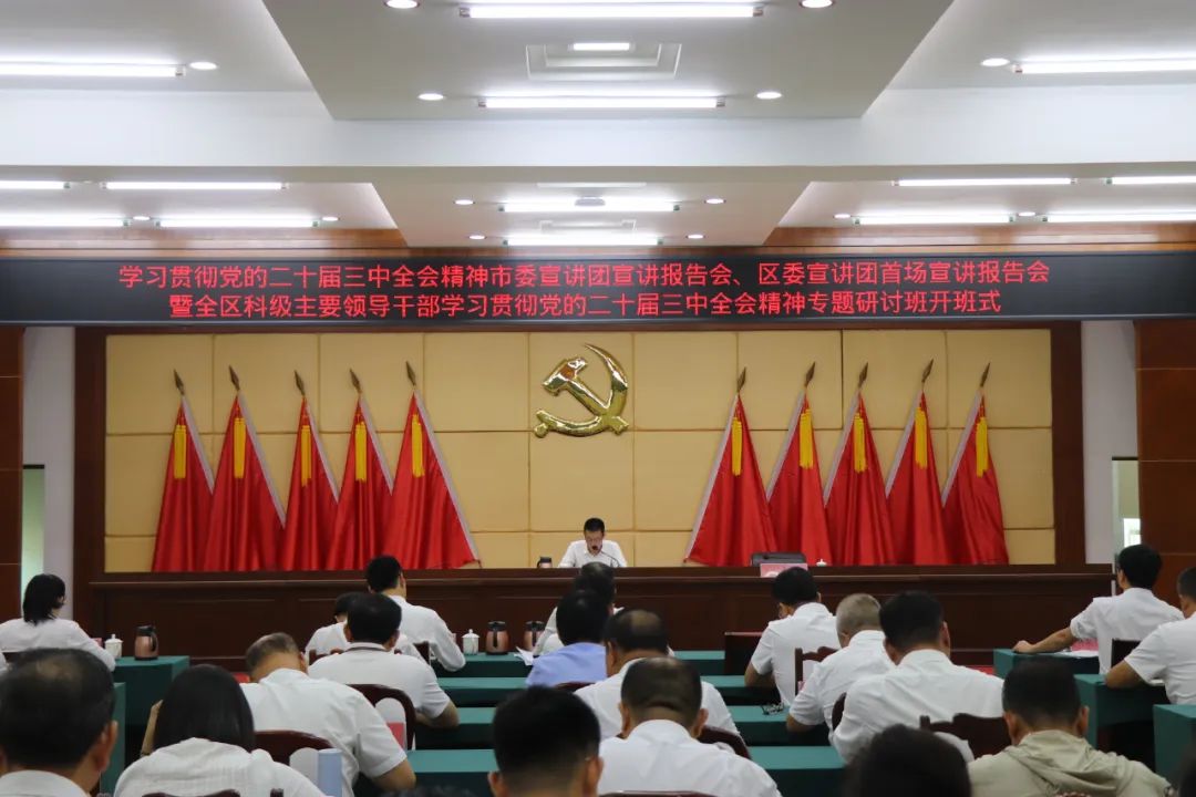 根据党中央统一部署及省委、市委、区委工作安排,8月12日,我区举行学习贯彻党的二十届三中全会精神市委宣讲团宣讲报告会、区委宣讲团首场宣讲报告会暨全区科级主要领导干部学习贯彻党的二十届三中全会精神专题研讨班开班式。市委宣讲团成员、区委书记、管委会主任、区委宣讲团团长林永长作宣讲主题报告暨开班动员讲话,区委副书记、管委会副主任林建新主持开班式。