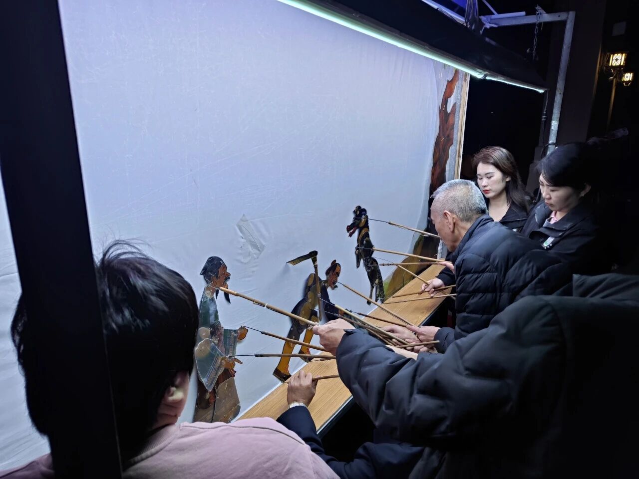 此次演出精选《龟与鹤》《东郭先生与狼》《猪八戒背媳妇》《狐狸与乌鸦》等经典皮影剧目,兼具童趣与传统智慧。舞台上,资深老艺人指尖操纵竹签,皮影角色在幕布上灵动起舞,高亢唱腔搭配铿锵锣鼓声,将经典故事演绎得活灵活现。居民们扶老携幼、老戏迷重温儿时记忆,孩童沉浸光影幻境,现场掌声、笑声不断。演出结束后,老少艺人们和小观众们、志愿者在幕布前合影留念。
