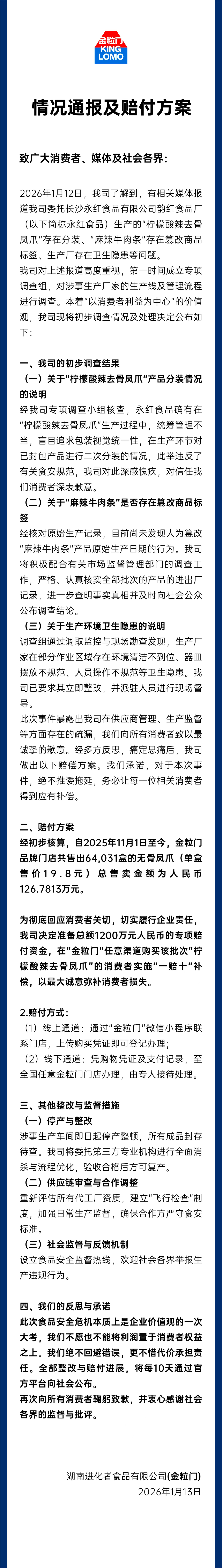 关于赔付方案,经初步核算,自2025年11月1日至今,金粒门品牌门店共售出64031盒的无骨凤爪(单盒售价19.8元),总售卖金额为人民币126.7813万元。公司准备总额1200万元人民币的专项赔付资金,对在"金粒门"任意渠道购买该批次"柠檬酸辣去骨凤爪"的消费者实施"一赔十"补偿。此外,设立食品安全监督热线。