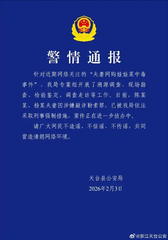对此,2月3日晚,浙江省台州市天台县公安局发布警情通报:针对近期网络关注的“夫妻网购娃娃菜中毒事件”,我局专案组开展了溯源调查、现场勘查、检验鉴定、调查走访等工作。目前,陈某某、杨某夫妻因涉嫌敲诈勒索罪,已被我局依法采取刑事强制措施,案件正在进一步侦办中。