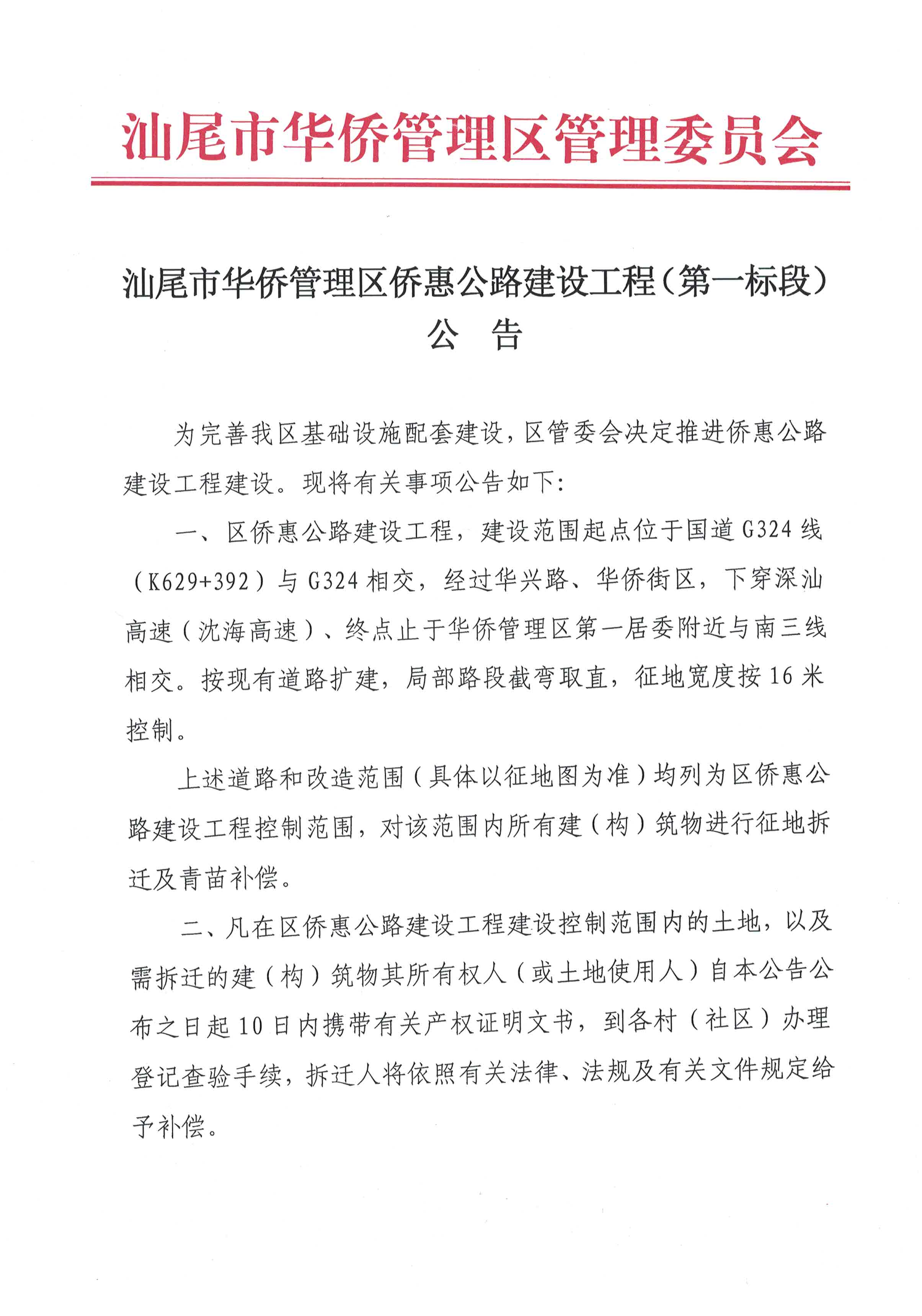 汕尾市华侨管理区侨惠公路建设工程(第一标段)公告