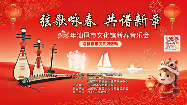 活动一:共赏善美文之韵 活动名称:“粤新年·艺起寻岭南”汕尾市文化馆线上线下展播活动 活动时间:2月16日(除夕)至3月3日(正月十五) 活动内容:精选我市历年稀有剧种与群众文艺创作的优质成果,重点遴选贴合2026马年新春氛围、展现汕尾高质量发展、传递时代正能量的精品力作进行展播。 活动地点 线下:汕尾市文化馆多功能室 线上:微信公众号“汕尾市文化馆” 活动二:艺起打卡接福气 活动名称:“瑞马贺春 艺起接福”馆里馆外打卡活动 活动时间:2月16日(除夕)至3月3日(正月十五) 活动内容:围绕春节氛围和文化特色,在馆里馆外布置新春打卡场景,营造浓厚节日氛围,让市民游客沉浸式体验兼具观赏价值与文化内涵的新春韵味。 活动地点:汕尾市文化馆 活动三:骏马欢歌报新春 活动名称:“弦歌咏春 共谱新章”2026年汕尾市文化馆新春音乐会 活动时间:2月19日(农历正月初三)14:00 活动内容:演出聚焦海陆丰民乐与戏曲音乐特色,精选经典民族乐曲、市文化馆民乐团原创作品,并融合地方戏曲唱段,让市民游客感受传统民乐的独特魅力,品味扎根汕尾的本土文化宝藏,进一步塑造立体的海陆丰音乐形象,展现传统文化与民俗音乐的醇厚风韵。 活动地点:汕尾市城区屿仔岛 活动四:祥腔瑞曲迎春来 活动名称:“瑞马呈祥 曲韵迎春”2026年汕尾市地方戏曲交流迎春茶会暨名伶名曲展演 活动时间:3月2日(正月十四) 活动内容:以休闲社交的茶会形式,为听众提供汕尾特色传统糕点,邀请戏曲艺术家、小戏迷代表登台献艺,带领市民游客领略我市非遗项目西秦戏、白字戏及正字戏名伶名曲的独特魅力。 活动地点:汕尾市文化馆 报名方式:后续留意本公众号动态。