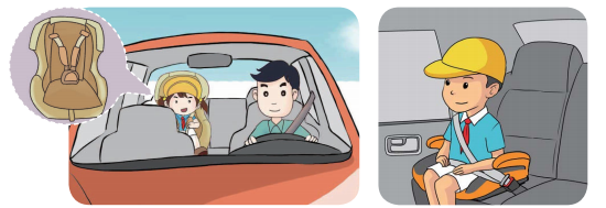 5、乘坐私家车时,12 岁以下的儿童要坐在后排;不满 6 岁的小朋友要在后排乘坐儿童安全座椅,6~12 岁的小朋友要坐在后排的安全座垫上,系好安全带。