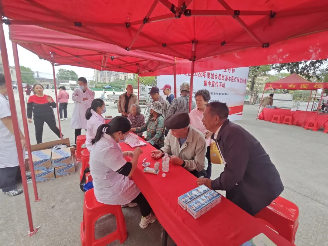 本次活动通过设立政策咨询台、摆放宣传展板、悬挂主题横幅等方式营造浓厚的参保宣传氛围。 活动中,医护人员免费为居民开展健康咨询、血压、血糖测量,医保部门工作人员通过发放宣传手册、一对一讲解等方式,向居民讲解2026年度城乡居民医保参保缴费、“粤医保”绑定家庭共济关系操作流程、基本医疗保险参保长效机制政策和医疗保障待遇等惠民政策,将“医保宣传+健康服务”有机结合;活动现场还设置了“医保缴费区”,居民现场缴纳城乡医保费可获得雨伞、手机支架等精美礼品,活动现场参与人数超200人次,进一步提升了居民的参保意识和政策知晓率,营造了积极参保的良好氛围。
